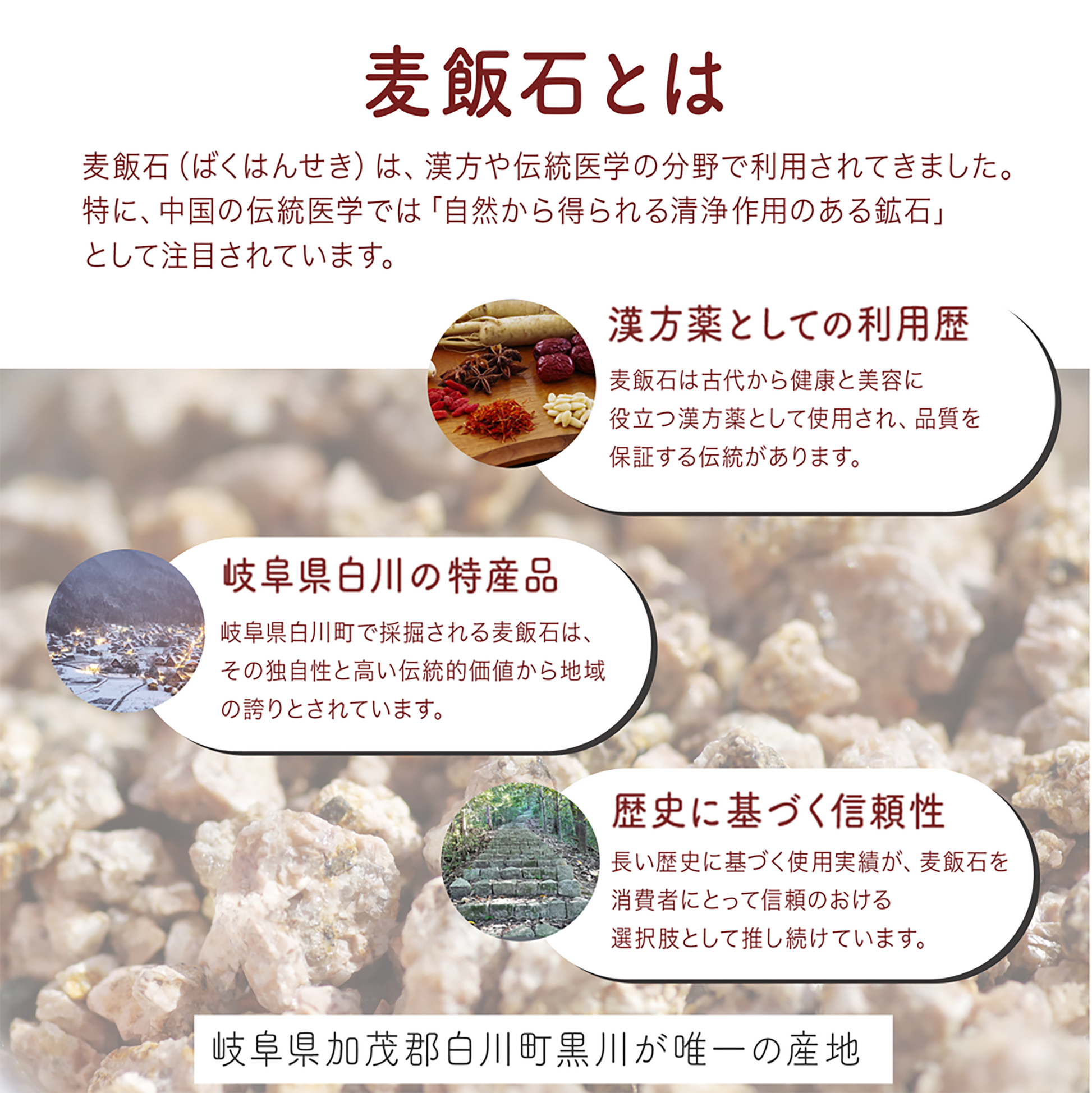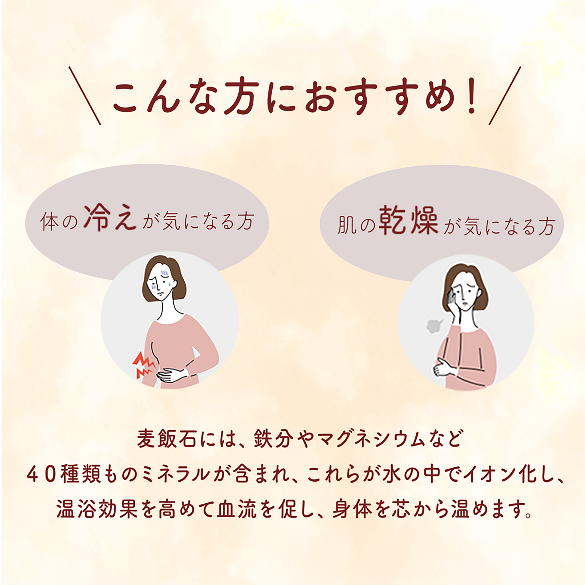 麦飯石には鉄分やマグネシウムなど40種類ものミネラルが含まれており、お風呂で使用することでこれらが水の中でイオン化し、細胞膜から吸収されて、細胞の働きを活発にする、と考えられています。