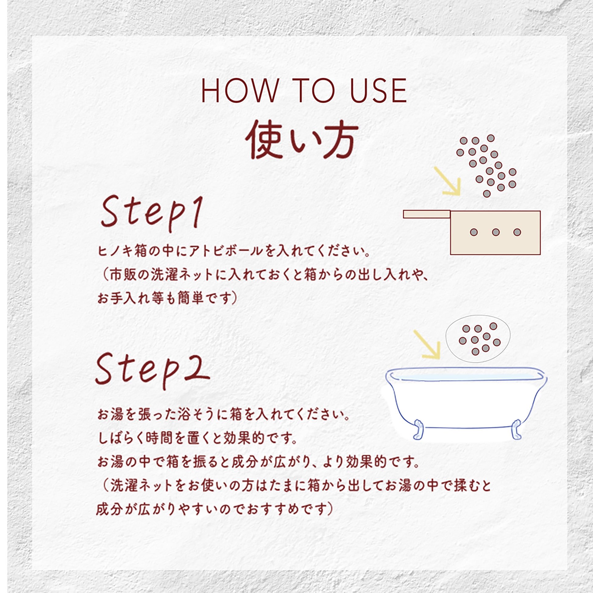 ステップ2:お湯を張った浴槽にアトピボールが入ったヒノキの箱を箱ごと入れ、しばらくそのままおいて下さい。お湯の中で箱を振ると成分が広がります。