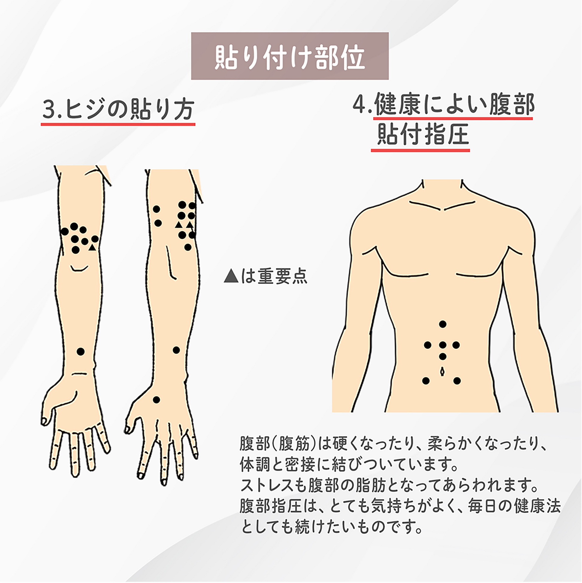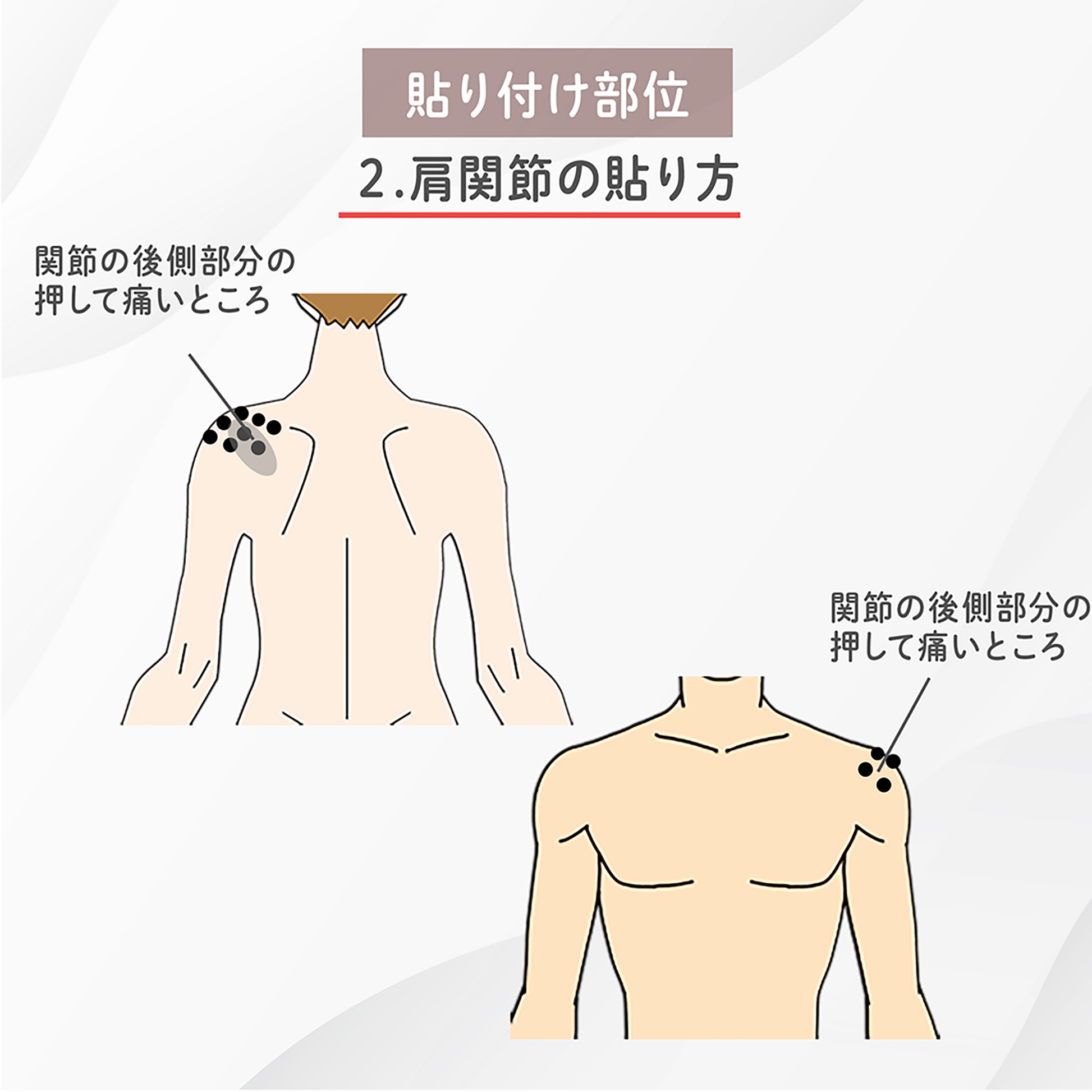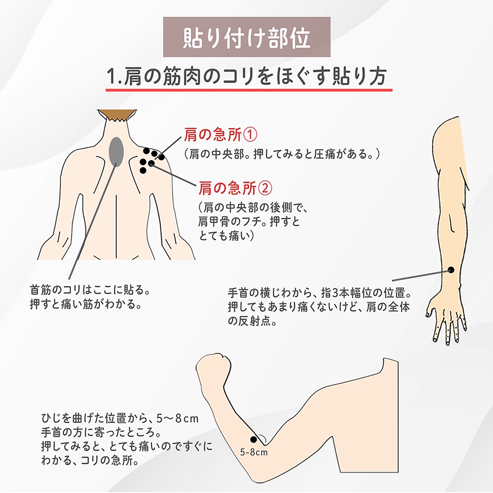 - 同梱の「貼り方のアドバイス」に沿って使用することで、肩・肩関節・肘、腰などのツボに働きかけ、血行をよくし筋肉のハリをほぐします。