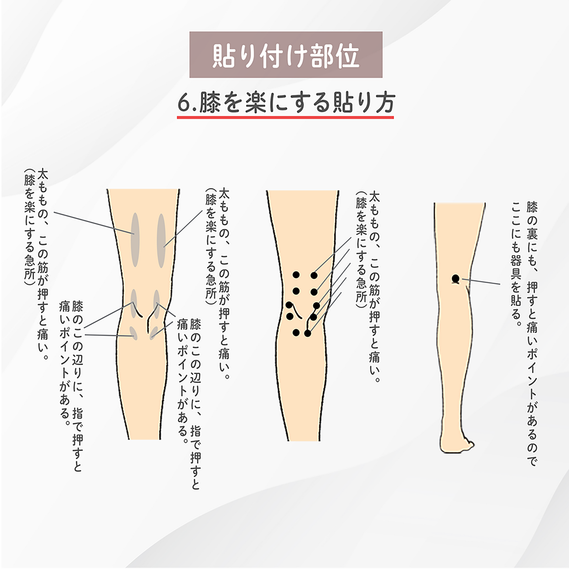 - ギクギクとつらいヒザ、固まってしまった腰、張っている肩などつらい箇所に集中的に貼ることで、とてもラクになっていきます。