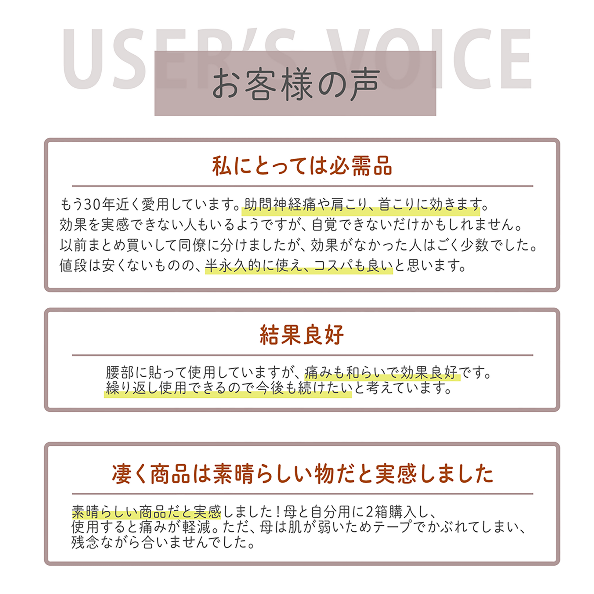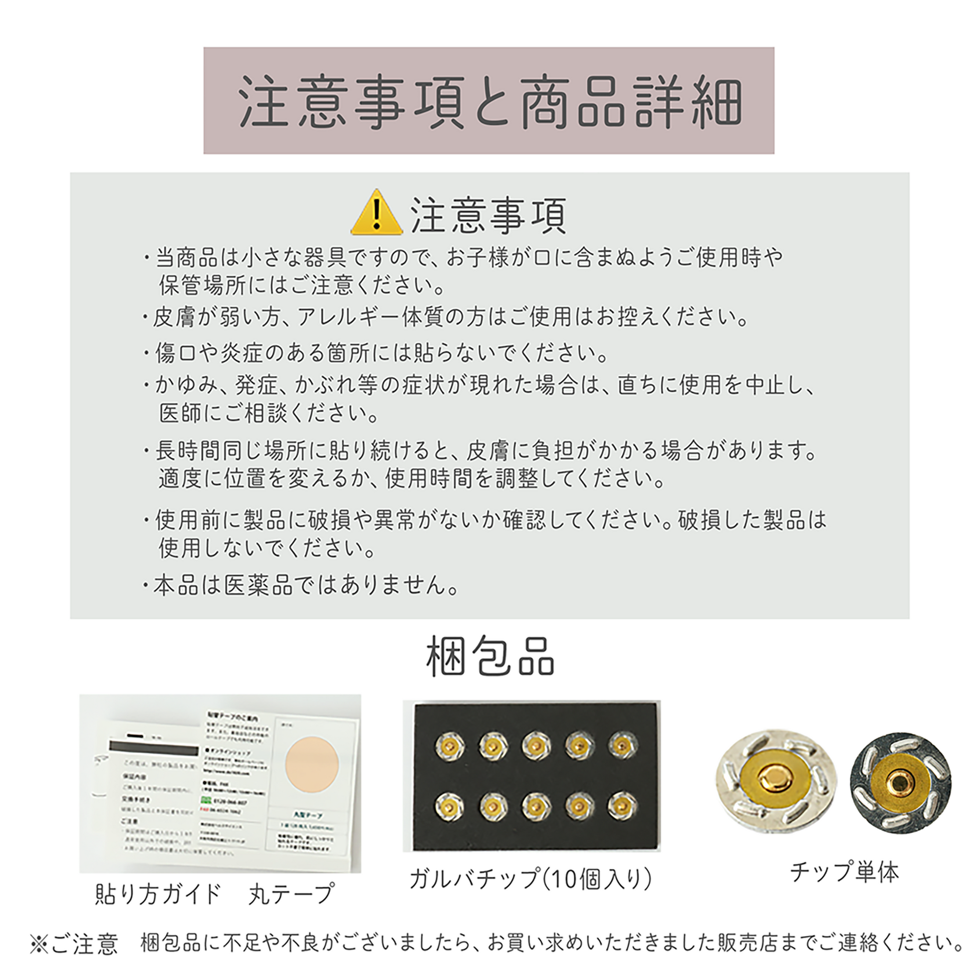 - テープを使うため、皮膚が弱い方、アレルギー体質の方、傷口や炎症のある方はご使用をお控え下さい。